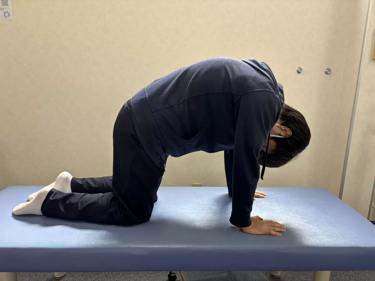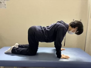 四つ這いになり、右手と左手を真っ直ぐに伸ばします。