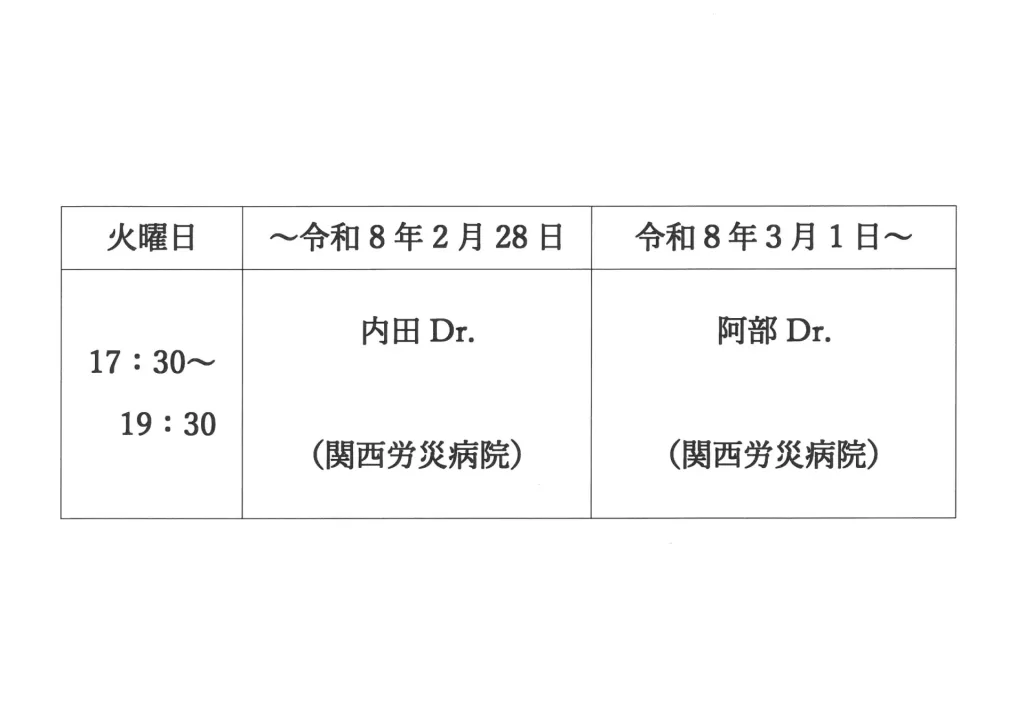 令和8年3月1日より、火曜日の午後診の体制が下記の通り変更となりますので、ご確認ください。